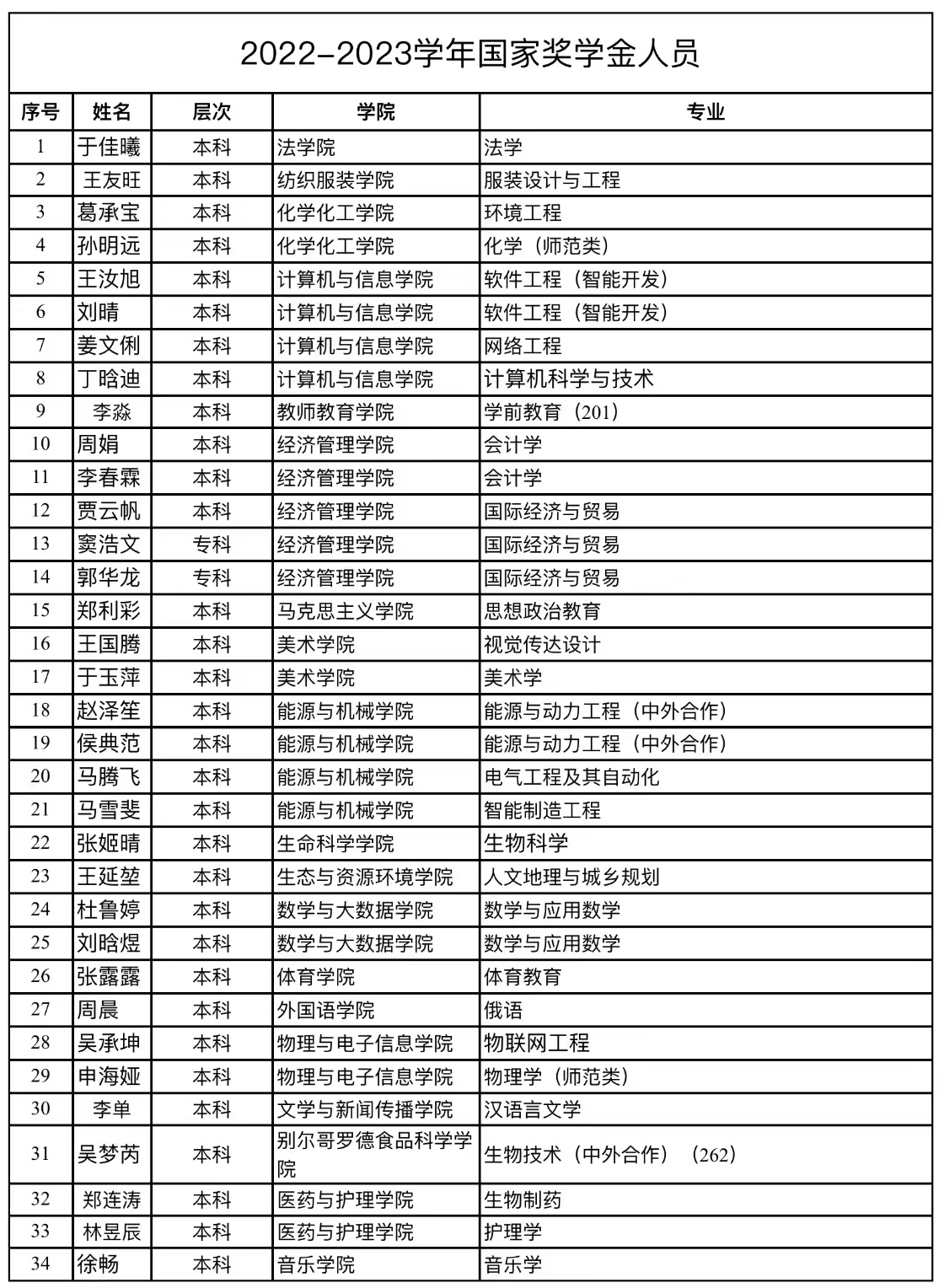 根据山东省教育厅《关于开展2023年奖学金评审和材料报送工作的通知》(鲁教财函〔2023〕56号)、《山东省学生资助资金管理办法》(鲁财科教〔2021〕15号)、《山东省学生资助管理标准》文件精神,德州学院本着公开、公平、公正、择优的原则,经评审委员会审议通过国家奖学金34人。