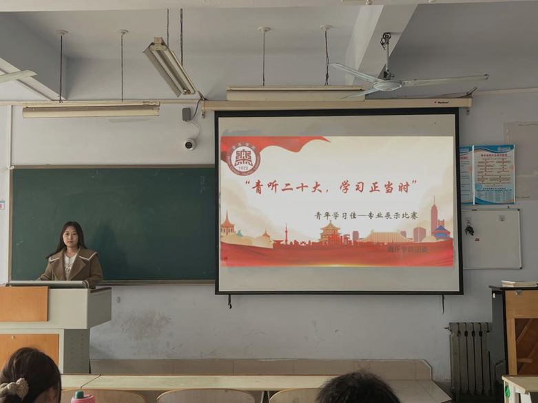 为深入学习宣传贯彻党的二十大精神,加强青年学生对二十大的学习和理解。3月18日上午,音乐学院团委在0261教室举行“青听二十大,学习正当时”——青年学习“佳”专业展示比赛。