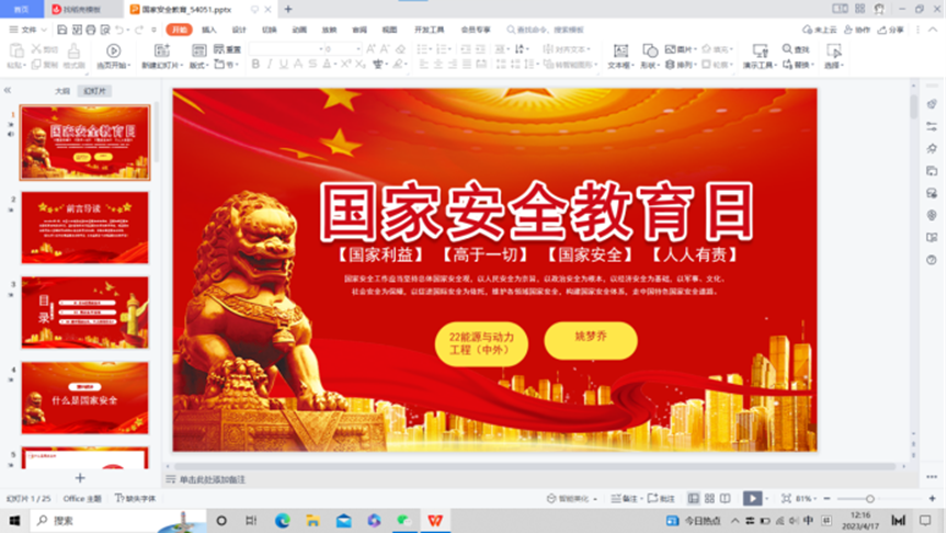 本次活动主要围绕国家安全相关知识展开,主要内容包括国家安全包括的16个方面的基本安全内容及一些危害国家安全的事例,以此来警示大家自觉维护遵守国家安全法。除此之外,能源与机械学院学子以ppt和短视频的形式踊跃参加了此次活动,进一步交流了国家安全的相关知识及自身感悟。