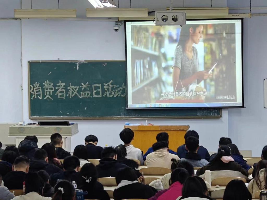 在讲座现场,学生代表以生动的语言给学生们详细讲解。在讲座中中,通过观看相关视频来创优消费环境,提振消费信心。让学生们作为消费者敢消费、能消费、愿消费。消费过程更加安全放心、便捷舒心从而实现提振信心、促进消费的目标。