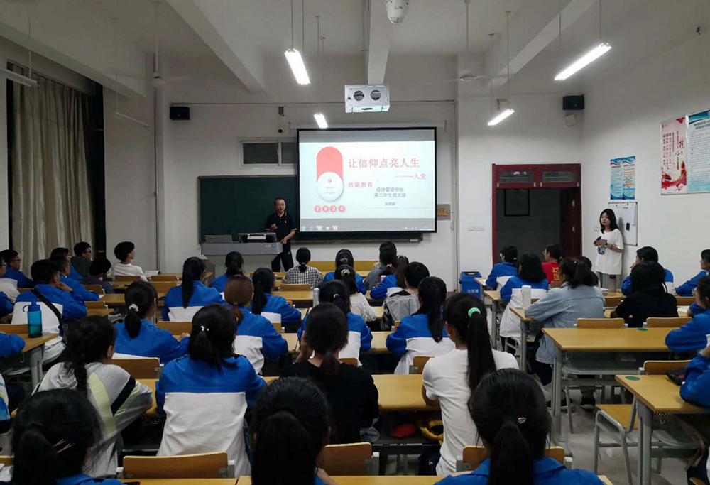经济管理学院第一、第二学生支部书记主要从中国共产党的发展历程、怎样端正入党动机和如何加入中国共产党等三个方面给2020级新生上了生动的入党启蒙第一课。在课堂上,学生支部书记通过中国共产党的光辉历程,党领导全国人民取得的伟大成就等方面入手;深度剖析了常见的不端正的入党动机类型,强调了新生要从思想上入党,保证入党动机的纯净性;对发展党员的流程进行了详细的说明,激发了新生强烈的入党意愿。