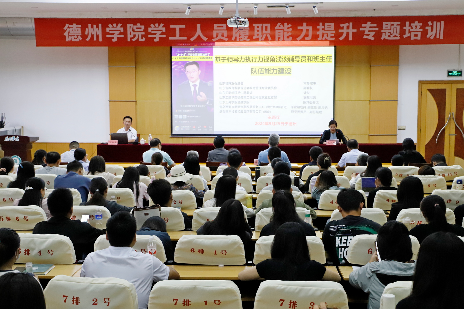 为贯彻落实党的二十届三中全会精神,帮助全体学工人员“尽快进入状态,尽快熟悉工作,尽快提高履职能力”。9月25日下午,学校举办学工人员履职能力提升专题培训,山东工商学院招生就业处处长、山东省就业促进会常务理事王西兵作专题报告。