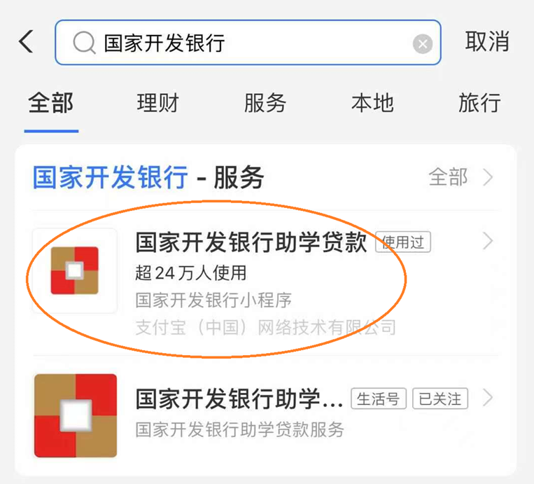 第三步:打开支付宝,搜索“国家开发银行助学贷款”,点击小程序或者生活号,点击在线还款。