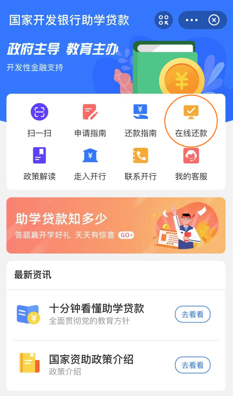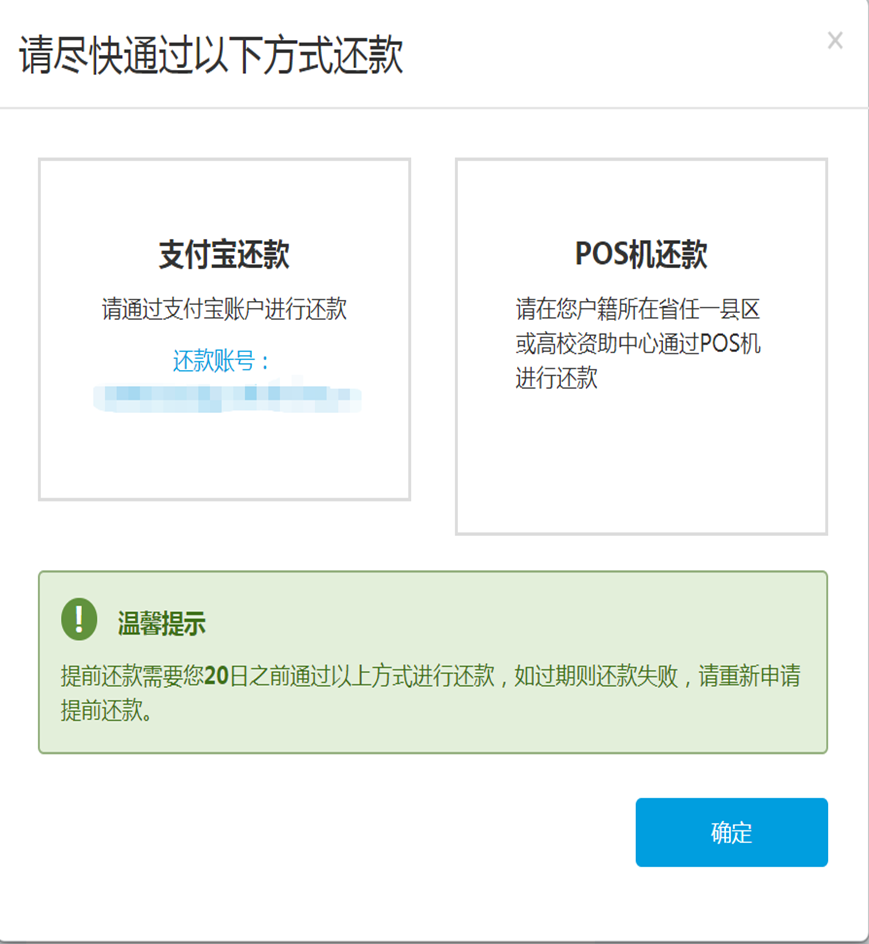 你还可以就近前往县区教育局学生资助管理中心或者高校资助中心(请事先咨询是否提供POS机还款服务)通过刷银行卡还款。