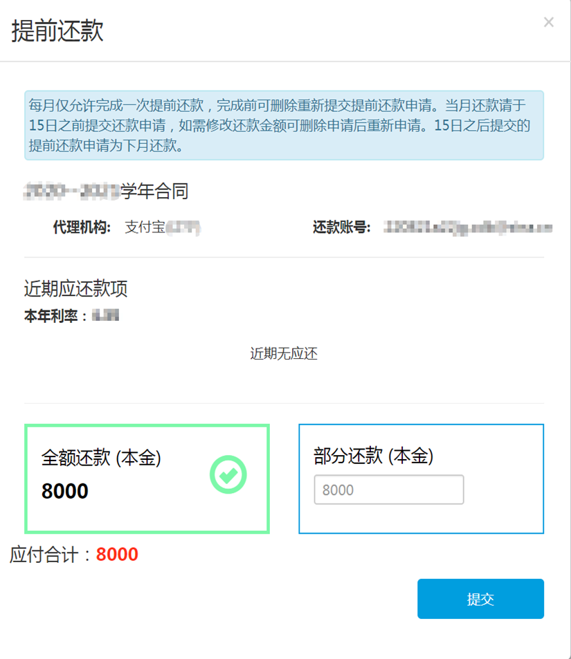 如果你发现自己的贷款中某一笔需要在毕业当年9月20号就要还本金的,你也可以参照上面第一种情况的操作,8月15日前对这笔合同申请提前还款,提前结清这笔合同。