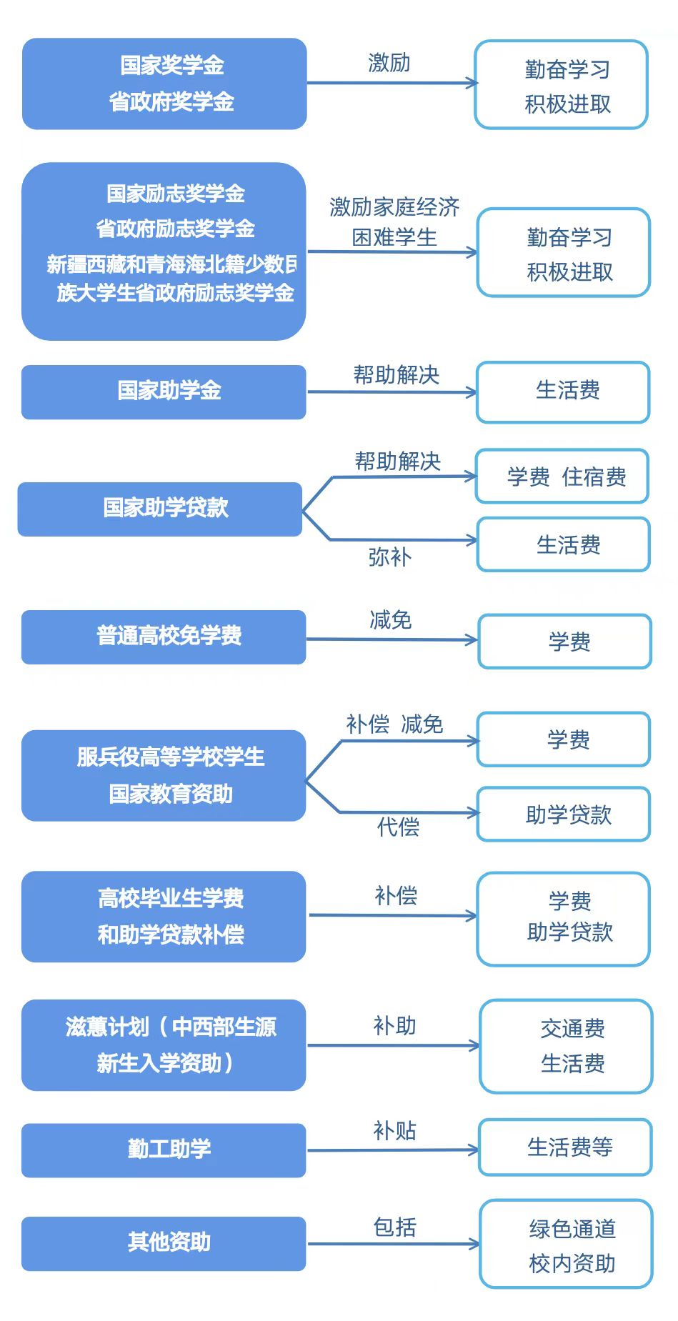 国家和我省在高等教育本专科阶段建立起国家和省政府奖学金、国家和省政府励志奖学金、国家助学金、国家助学贷款等多种形式有机结合的高校学生资助政策体系(如遇国家和省政策调整,以新政策文件为准执行)。