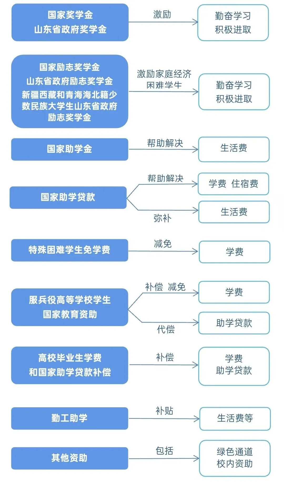 国家和我省在高等教育本专科阶段建立起国家和省政府奖学金、国家和省政府励志奖学金、国家助学金、国家助学贷款等多种形式有机结合的高校学生资助政策体系(如遇国家和省政策调整,以新政策文件为准执行)。
