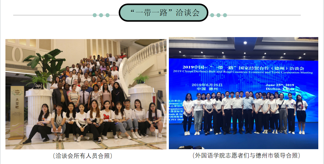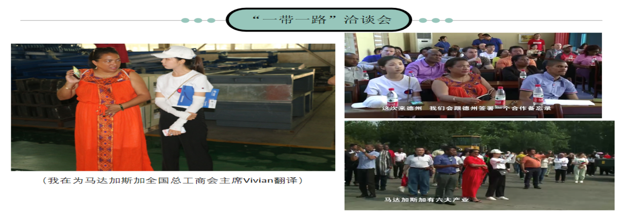 我对教育事业一直有一种向往,我积极参与的学校举办的暑期三下乡的活动,在和学生打交道的时候我非常开心,这也是为什么我主要考虑了教育作为我未来的发展方向。我参与德州市政府举办的一带一路洽谈会,作为外翻协会会长带领外国语学院20名同学参加活动。在场活动中,我们接待了近六十名来自不同国家的外宾,帮助他们与中方政府及企业取得联系,达成合作。我当时接待的是马达加斯加全国总共商会主席Vivian,也就是照片里的这位女士。当时德州电视台也过来采访,这也是我第一次看见我自己出现在电视上。