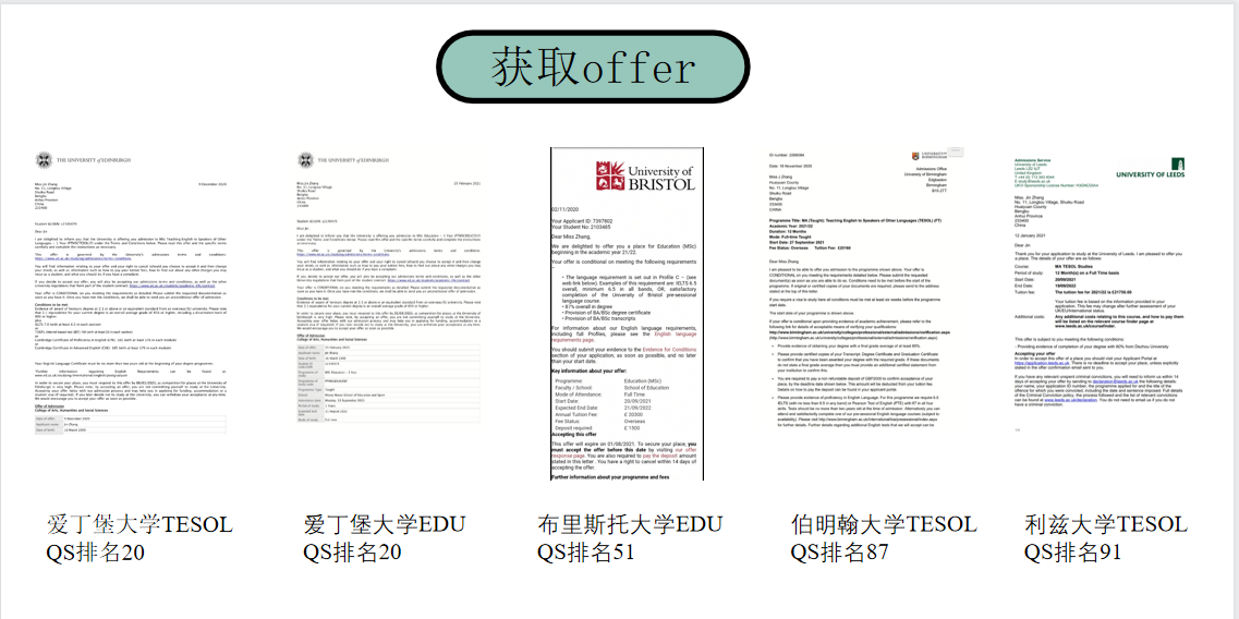 高分通过大学英语四、六级及英语专业四级考试,每年均获校级奖学金、“三好学生”荣誉称号,获得了9所英国大学共计十一份offer。